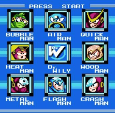 The game has one of the most iconic soundtracks in gaming, featuring unique instrumentation that isn't like any other NES game. All of the tracks are exciting and give each level a unique tone. Sound effects are improved, except for the annoying Dr. Wily UFO noise. A higher percentage of backgrounds are detailed. Level tiles are consistently well-done. The title screen is given an awesome opening animation and the stage select menu is improved drastically, featuring intimidating mugshots for each Robot Master. Unfortunately, the larger bosses cause a lot of flashing and sprite flickering.