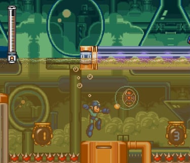Mega Man feels good and all the Special Weapons are very useful. The Rush Adaptors are fused together into a "Super Mega Man" suit that has to be collected with "RUSH" letters. Beat is moved to one hidden collectible and now lifts Mega Man out of pits instead of attacking enemies. This is much more useful. The Rush Coil is annoying and the Rush Jet is weak, but there's a new cool Rush Search which lets you dig items out of the ground. You can even unlock Proto Man's Shield. Almost everything in this game is useful and you feel like you have quite the arsenal.