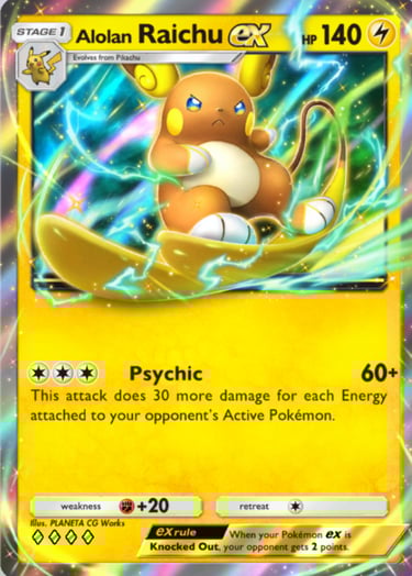 This card is okay, but it's nothing special. The Special Conditions are strong, but it takes too much Energy. You're better off using Pikachu ex or Alolan Raichu.