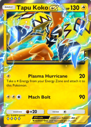 Tapu Koko ex ties the Lightning cards together by doing chip damage and flooding the board with Energy. 90 damage isn't bad, either. One Retreat Cost also helps you move into Pikachu ex at the end.