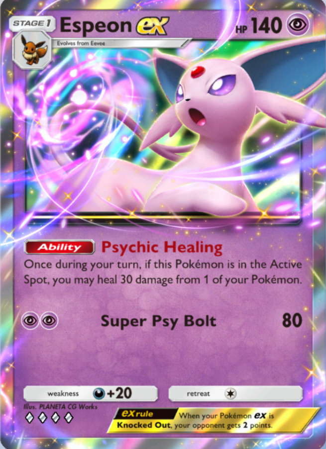Espeon is the perfect partner for Sylveon ex. Thanks to the Ability to have four Eevee, you can flood the board and simple switch between your Eeveelutions while you heal with Espeon's Ability. While we've seen that 80 damage isn't the best on an Evolved ex, Eevee bag can help ensure that Espeon can two-shot anything. Your opponent won't be able to say the same.